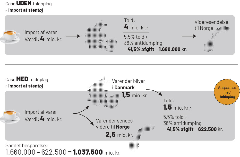 Lad os forestille os, at en dansk virksomhed importerer krus og tallerkener af stentøj for 4 millioner kroner. Der er måske 5,5% told på stentøjet samt 36% i antidumping. Det løber altså op i 41,5% i samlet told.