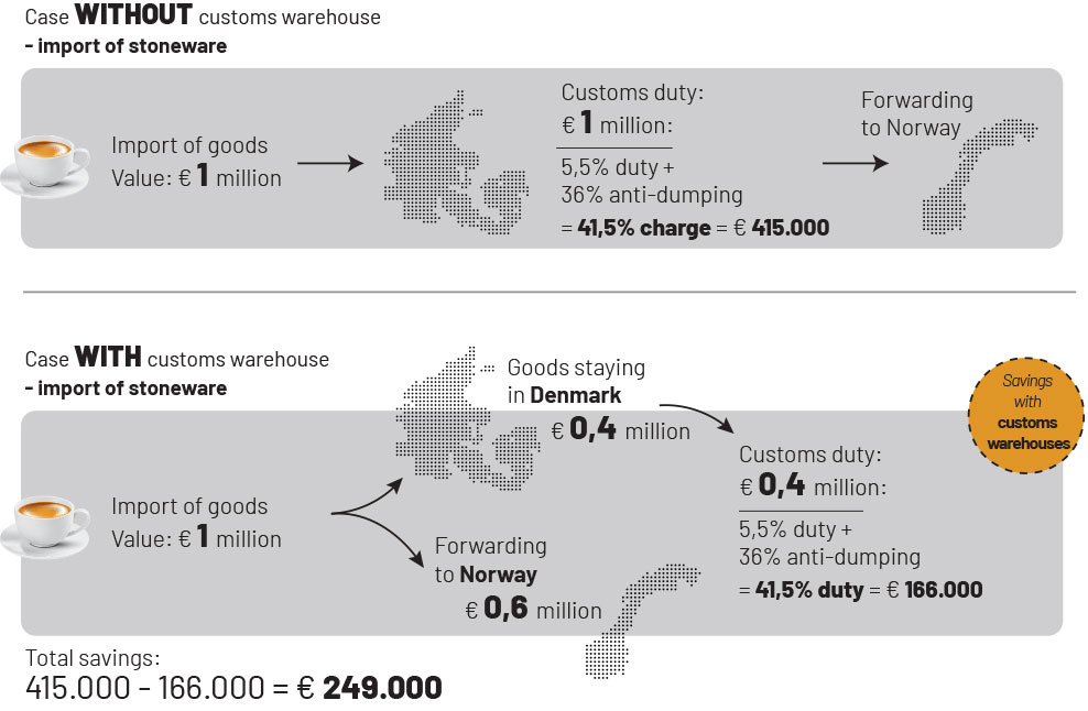 It is true that customs must still be paid in Norway, but the Danish customs duty of 41,5% is avoided in this situation by using a customs warehouse.